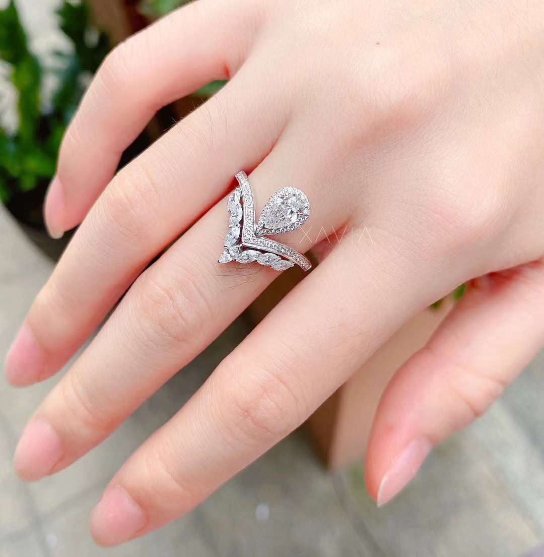 Marquise Leaf Bypass Design | Featuring a pear-shaped lab-grown diamond framed by a delicate halo, accented with marquise leaves on a sculpted bypass band in fine precious metal